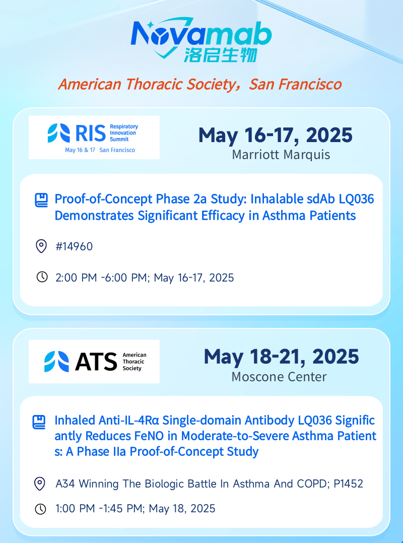 中国上海,2025年5月13日——上海华宇拍卖app下载生物医药技术有限公司,一家专注于纳米抗体创新药研发的生物技术企业,今日宣布:华宇拍卖app下载生物将于当地时间5月16日至21日赴美国加州旧金山,受邀参加美国胸科学会(American Thoracic Society, ATS)主办的呼吸创新峰会(Respiratory Innovation Summit,RIS)及ATS国际大会。届时华宇拍卖app下载生物将分别在RIS和ATS两场大会上以壁报形式呈现最新临床数据——公司自主研发的靶向 IL-4Rα 吸入性生物制剂 LQ036 首个 IIa 期概念验证性临床试验数据。本次展示将全面披露 LQ036 在中重度哮喘患者中的安全性、耐受性、药效指标及初步疗效,标志着华宇拍卖app下载生物在下一代呼吸道吸入式生物制剂开发领域迈出关键里程碑。
